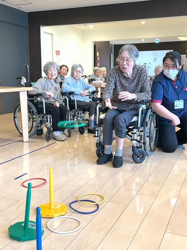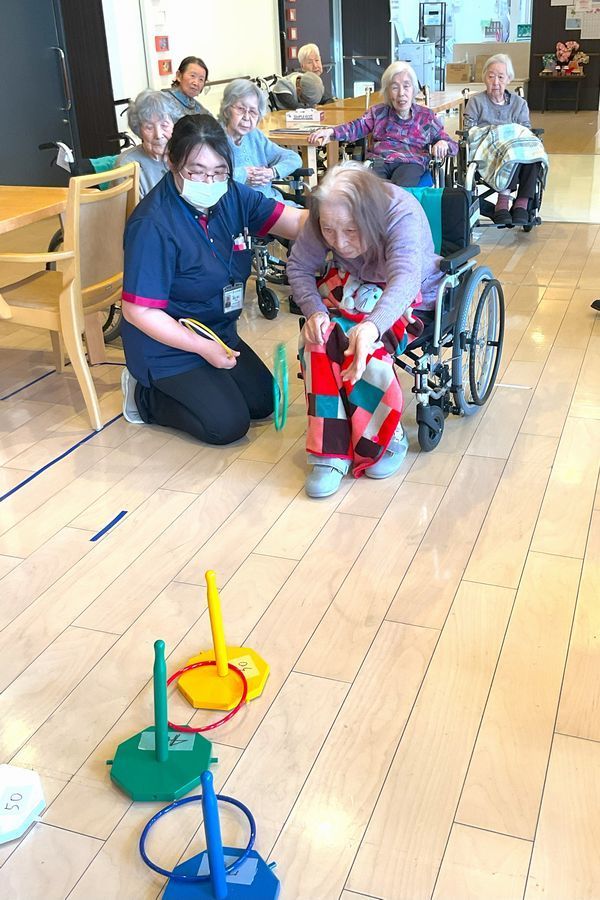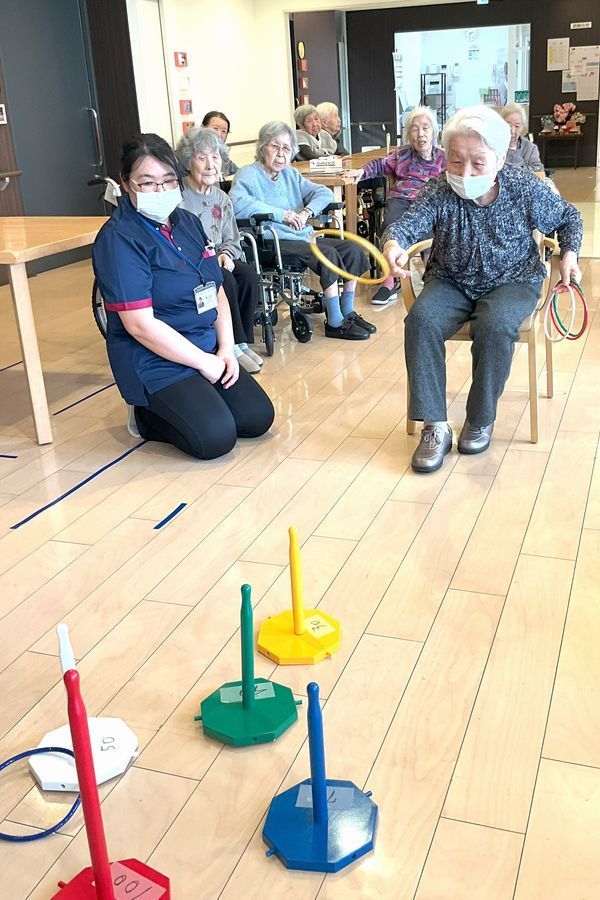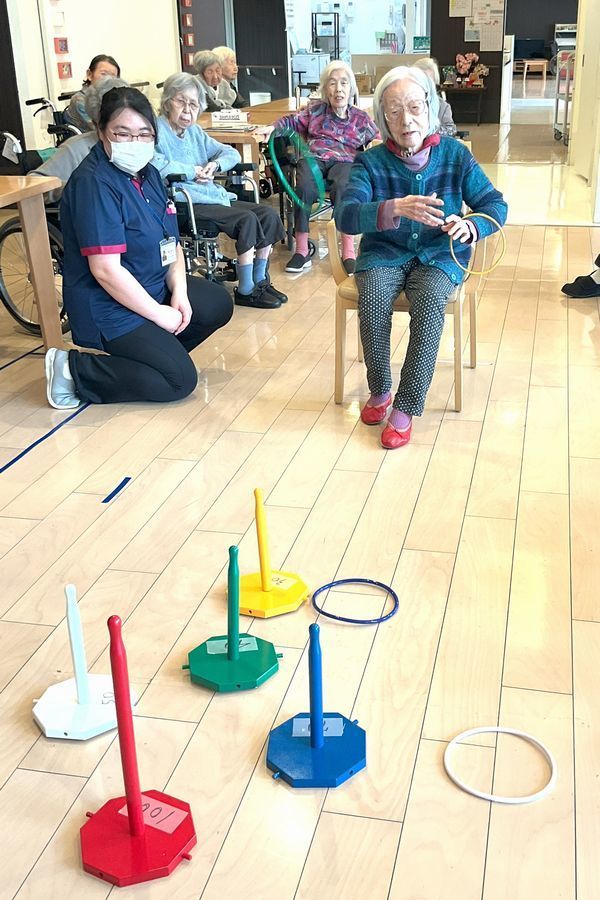 毎月誕生日会の日にはレクを行うのですが、今回のゲームは「輪投げ」です。