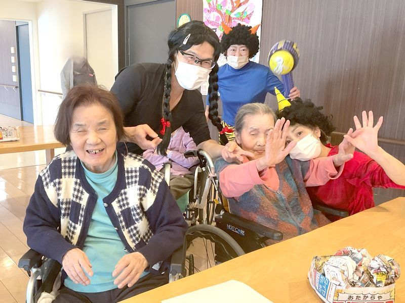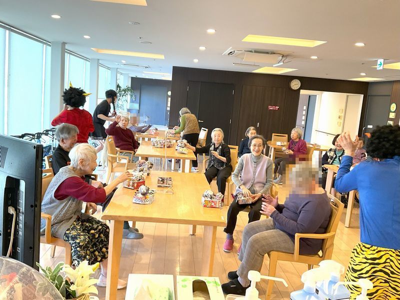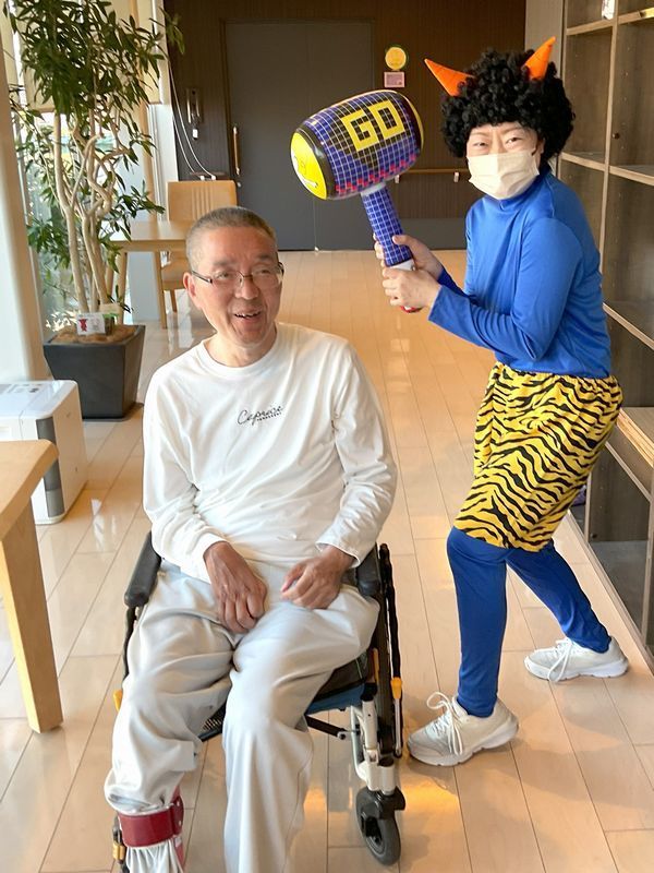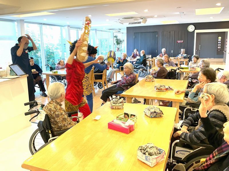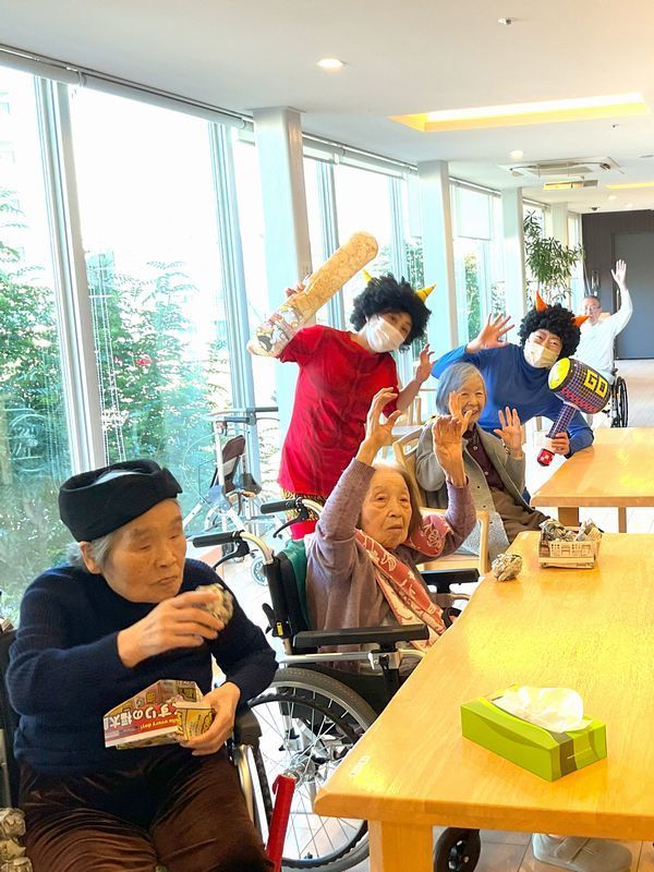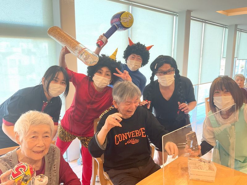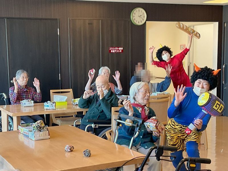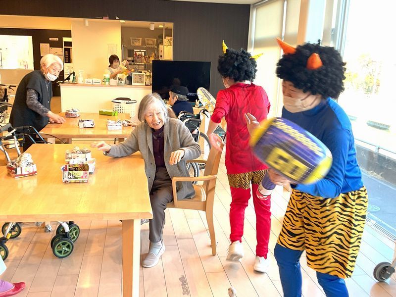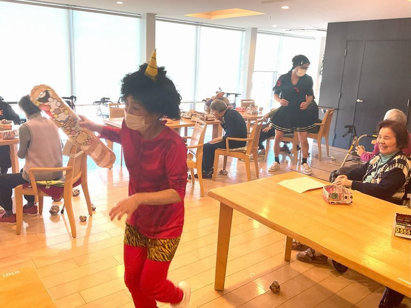 肝心の鬼はというと…赤鬼・青鬼に仮装したスタッフです。登場すると「かわいい~」と入居者様たちは鬼のかわいさに、あまり玉を投げないで笑顔で見守っています。
