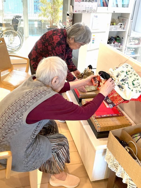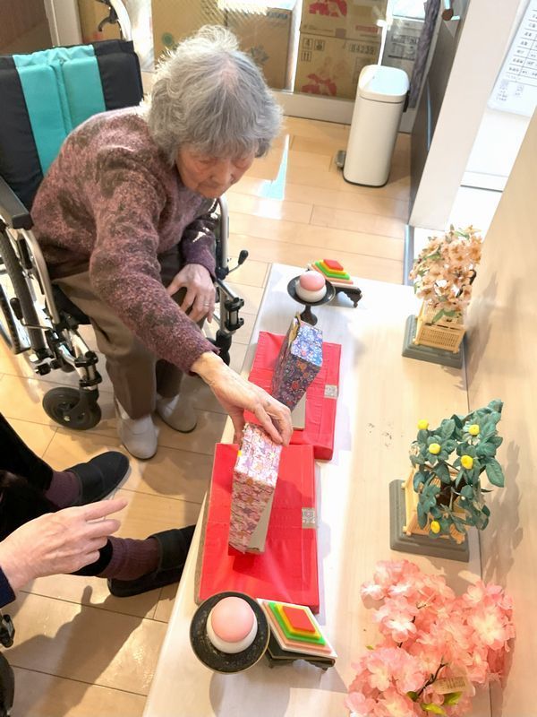 3階は立派なお雛様で「きれいね~」と。飾りを手に持たせて配置場所も均等になるように大事に飾っていただきました。