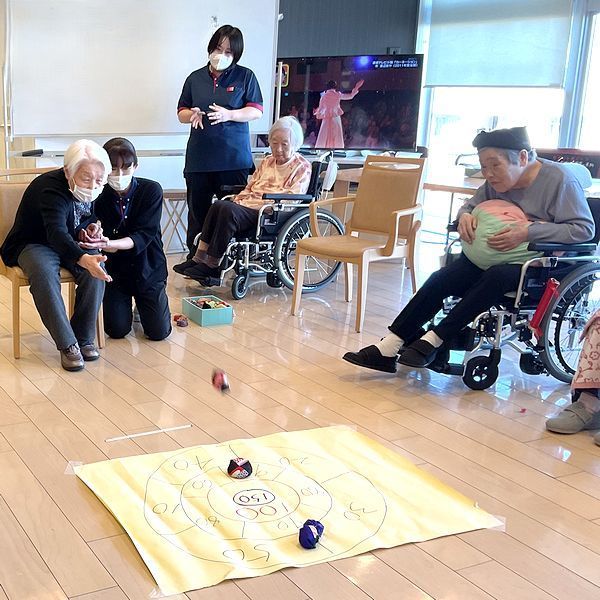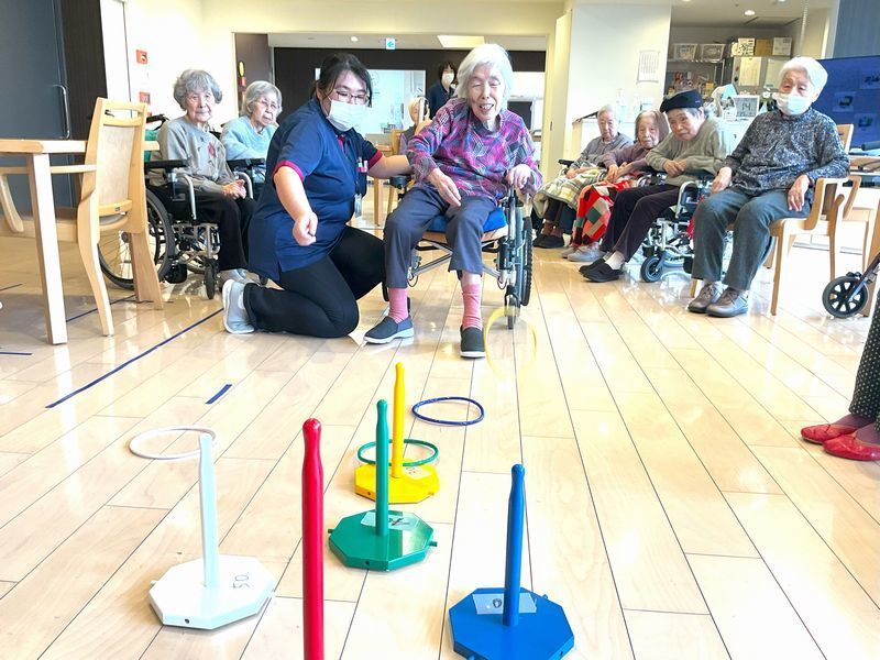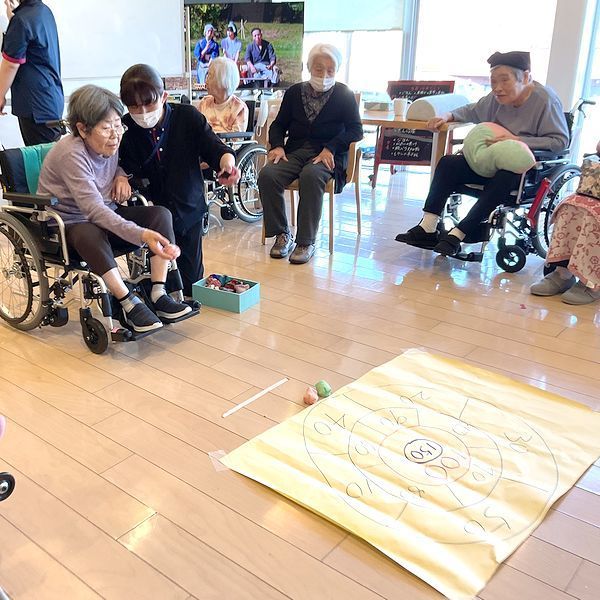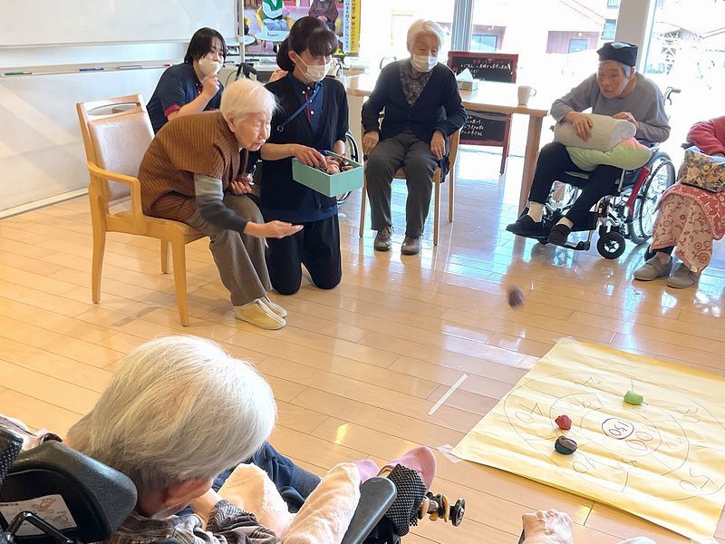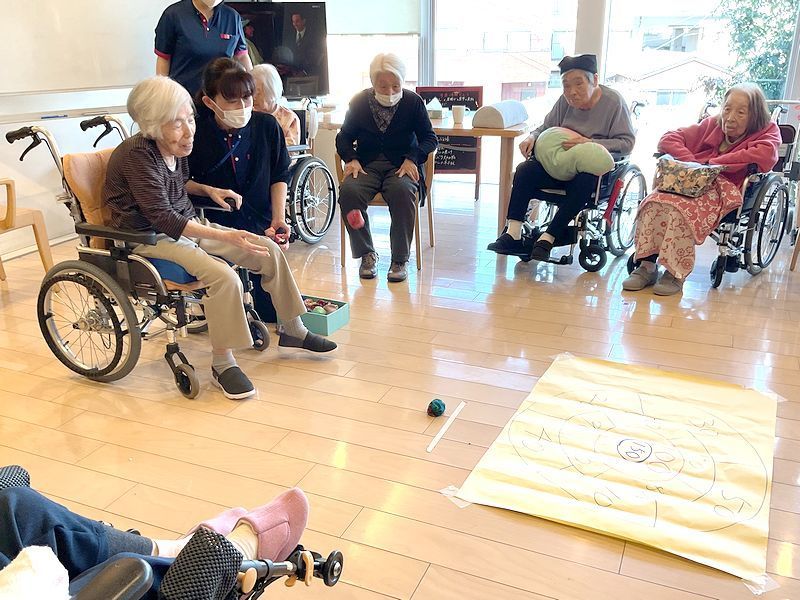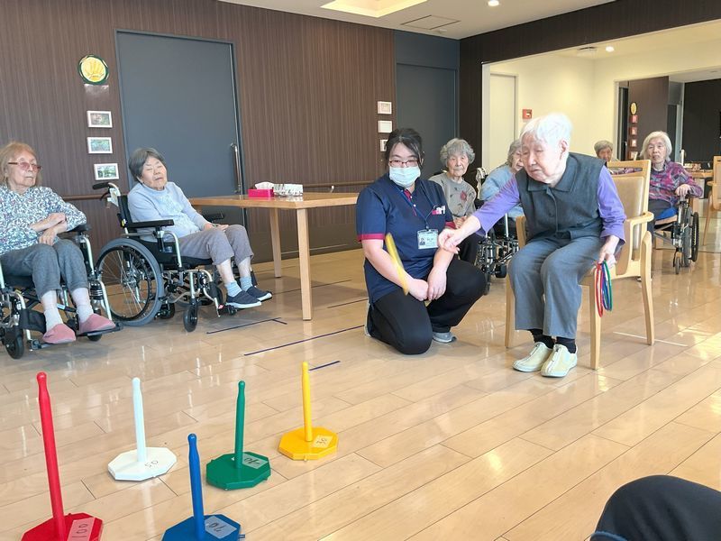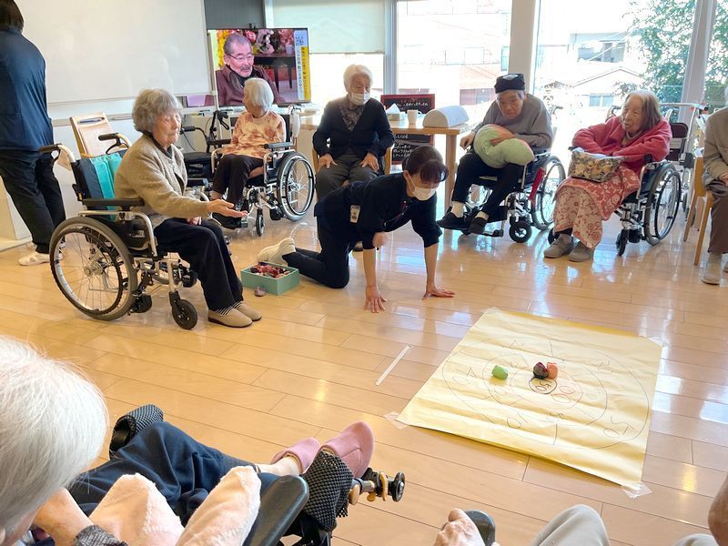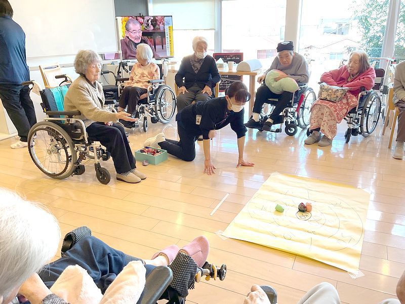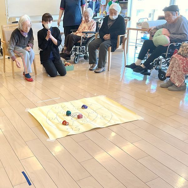 お手玉は入居者様が小さな頃に遊ばれた懐かしい遊びではあり、さらにあすもではお手玉系のレクが高頻度で登場することもあり、皆様手慣れた手つきでうまく落としていました。