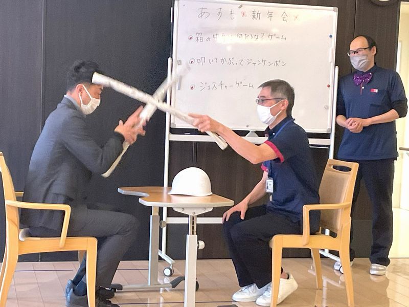 ルールを頭ではわかっていてもいざジャンケンをすると勝った瞬間に棒を持つのか?ヘルメットを持つのか?瞬時にわからなくなってしまい、互いに棒を持って叩き合おうとするシーンも見られました。果たして介護リーダーは上司である施設長の頭を叩くことができるのでしょうか?余興とはいえ、叩いてしまったらボーナスの査定に響いてしまうでしょうか?(笑)