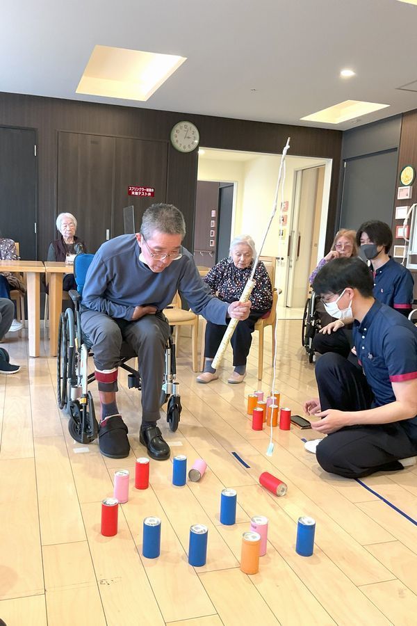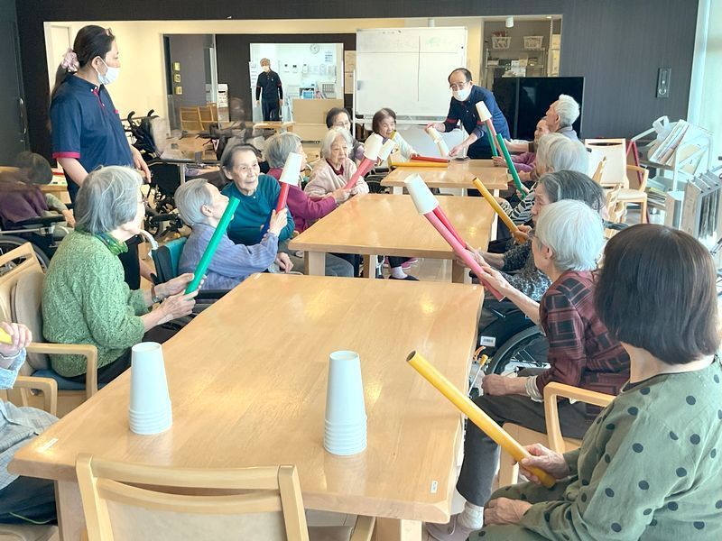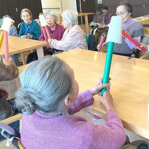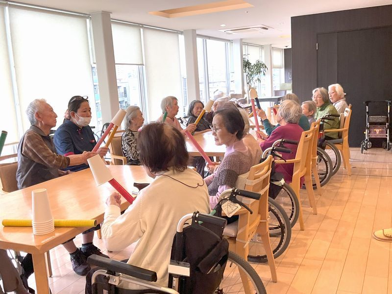 こちらはこの日初めて行った新しいレクリエーションで、棒を持って横一列に並んだ皆様が端から端まで紙コップを運んで、その速さを競うゲームです。途中でうまく渡せず手が止まってしまったり、時間がかかってしまったりとなかなかのスリルと緊張感の中で行われ、ドキドキを楽しんでいただけたようです!