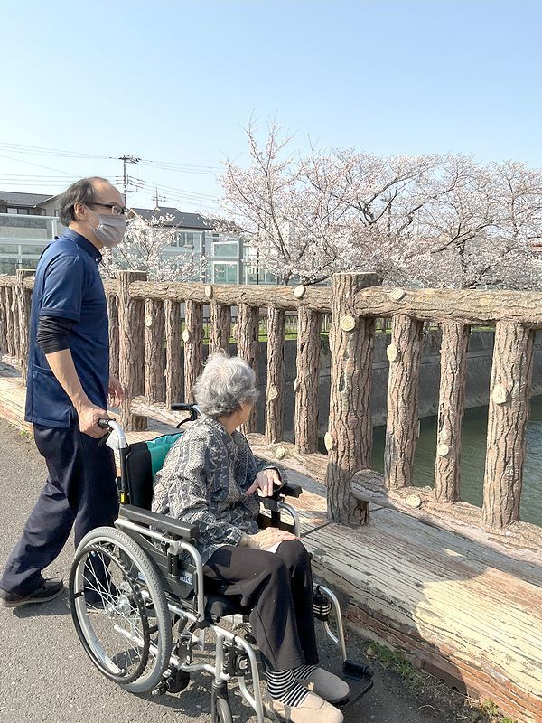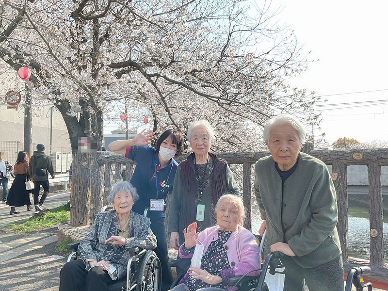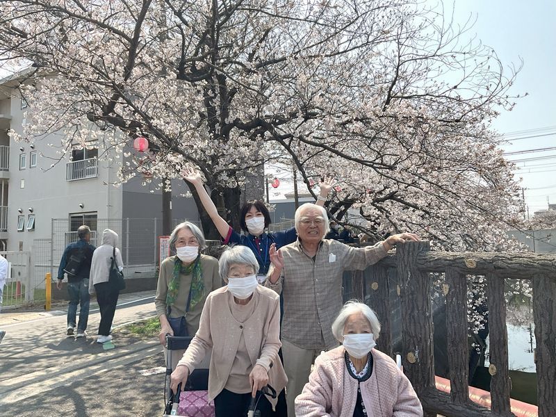 お花見をしていると、入居者様がご家族様と一緒に花見にいらっしゃり、偶然同じポイントでお会いしました。花見ポイントまでは道路が空いていれば車で5分ほどの所にあり、あすも市川からも歩いて行ける距離の為、改めて施設の立地の良さを実感しました。