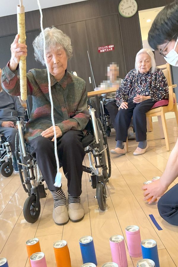 お手玉は入居者様が小さな頃に遊ばれた懐かしい遊びではあり、さらにあすもではお手玉系のレクが高頻度で登場することもあり、皆様手慣れた手つきでうまく落としていました。