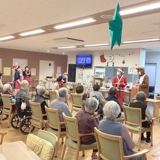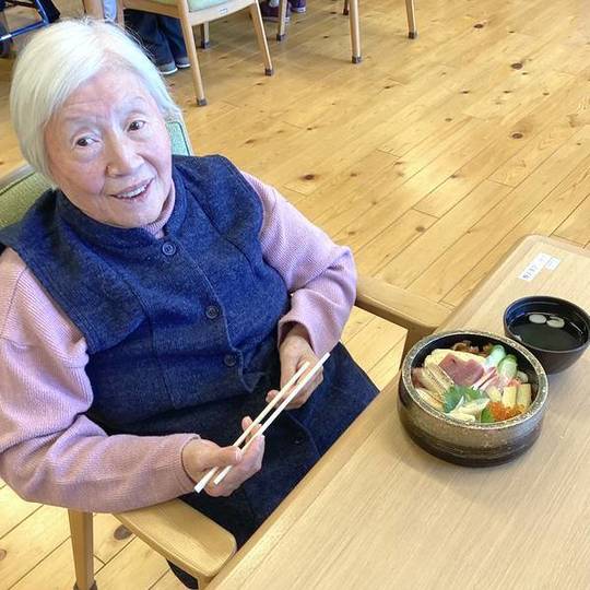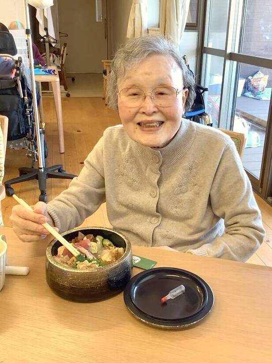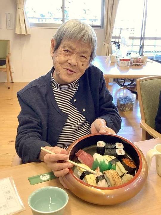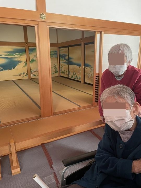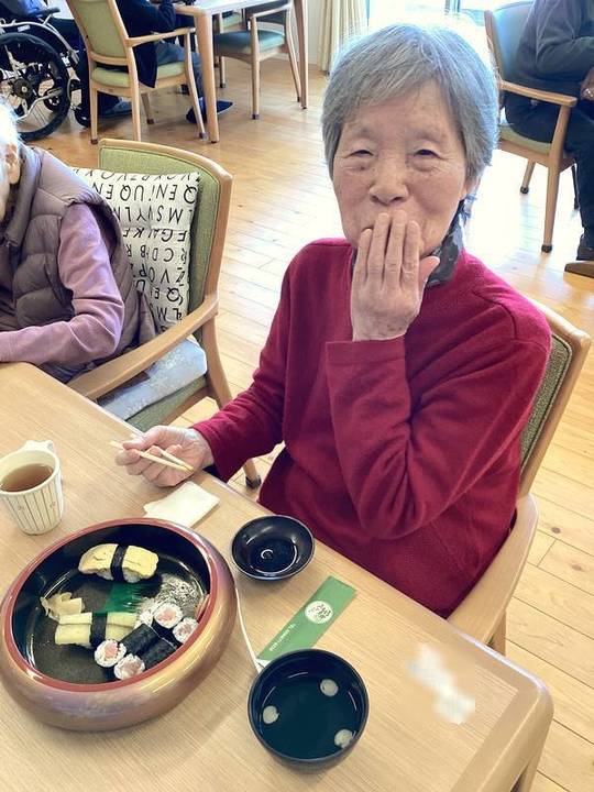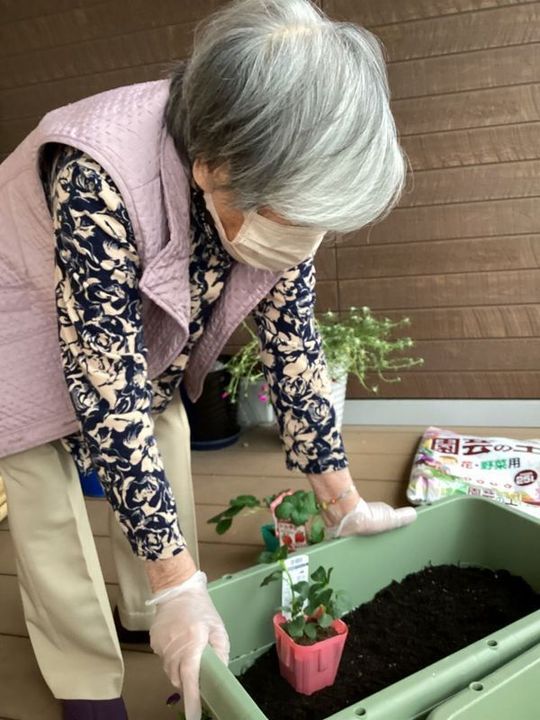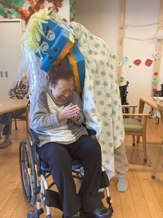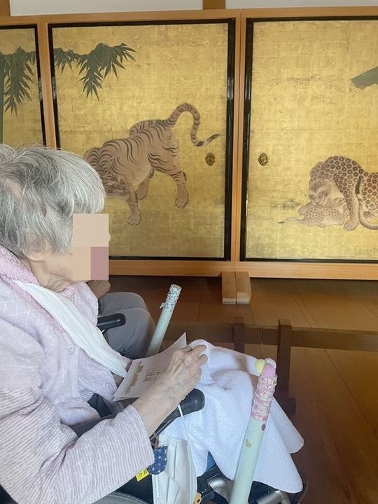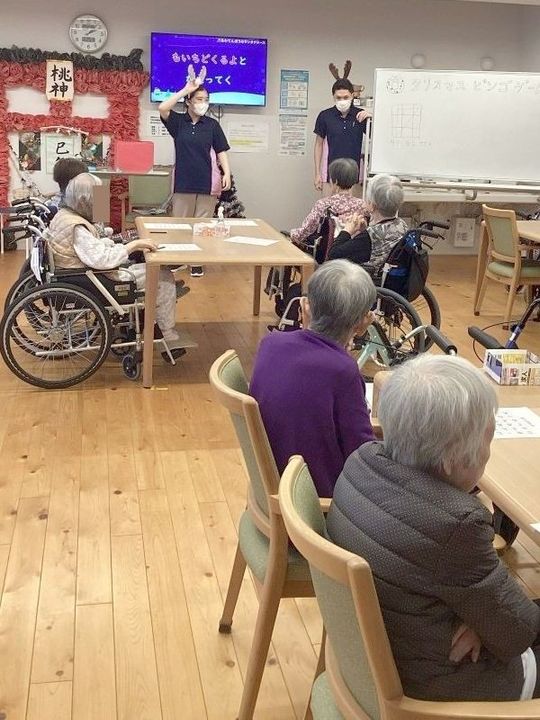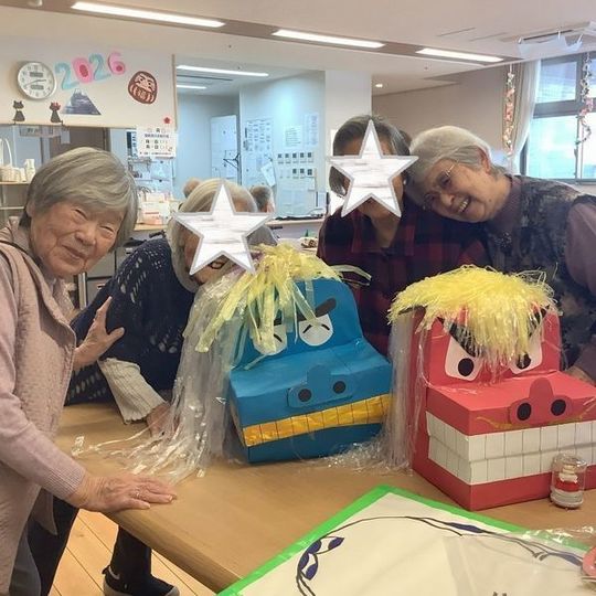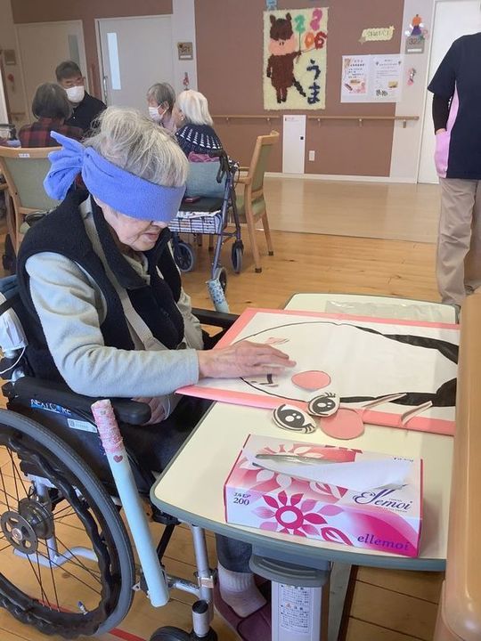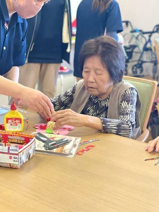 「ぷっくりして可愛いね♪」「あなたのセンスもいいわ(*^^*)」とお話しながら、お花や和柄のリボンも添えて配置していきます。糊付けは職員が手伝いながら楽しく仕上げていきました。