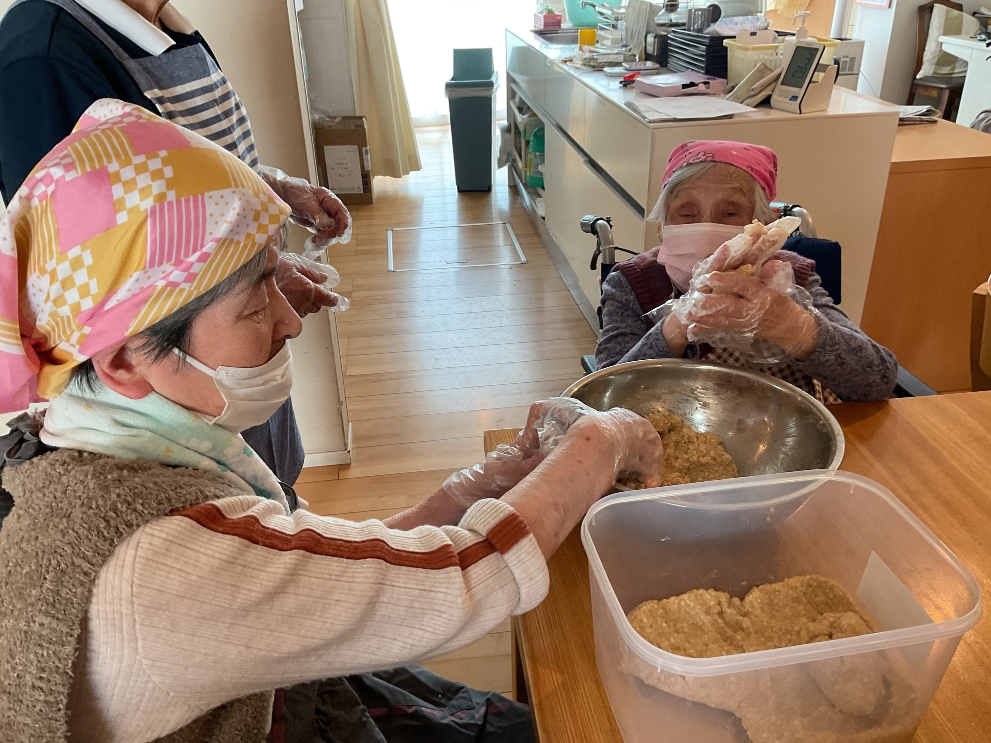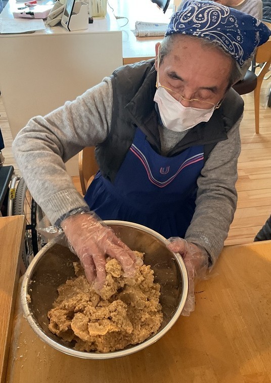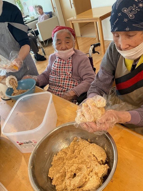 企画の段階で、皆様に味噌作りの経験があるかお伺いしましたが、その時は皆様「作った事ないわ!」と仰っておられたのですが、味噌づくりが始まると「そういえば昔こうやって作ってたな~」「空気入れない様に丸めないと!」等色々と思い出されたようで、とても楽しんで頂けました。