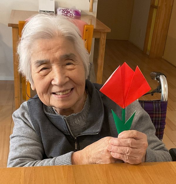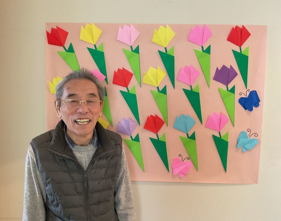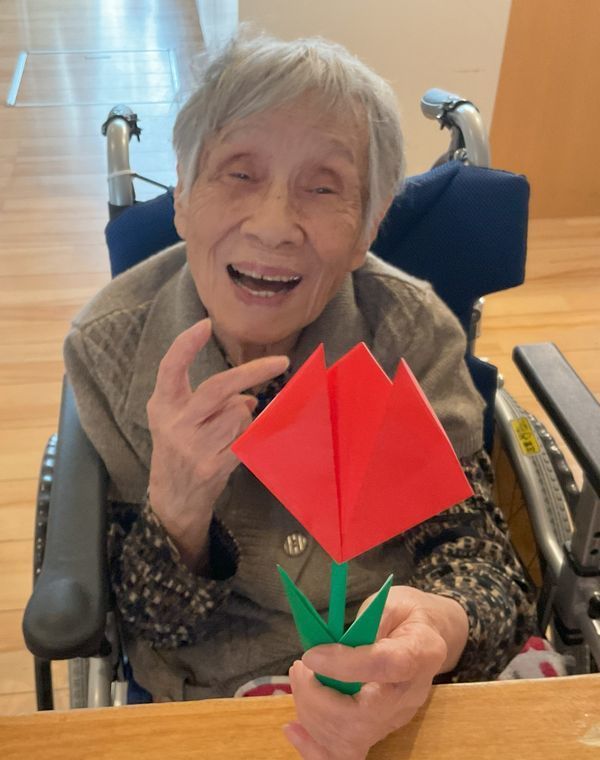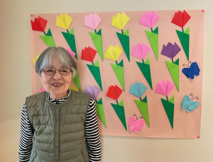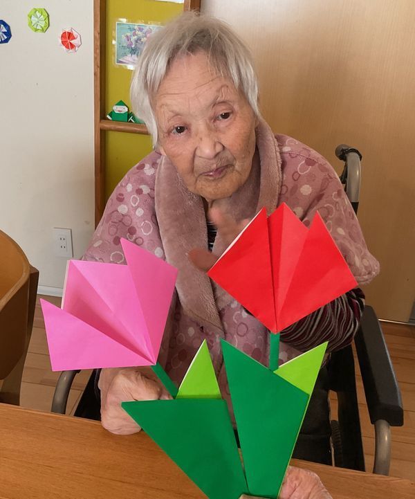 皆様に折り紙でチューリップの飾りを作って頂きました。