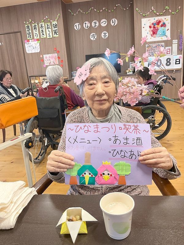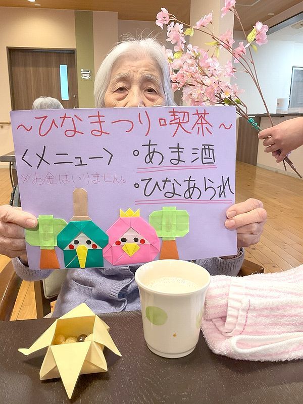 今年は各フロアに素敵な雛人形が飾られていたので、雛人形をみながらゆっくりひなあられや甘酒、ジュースを召し上がっていただきました☆