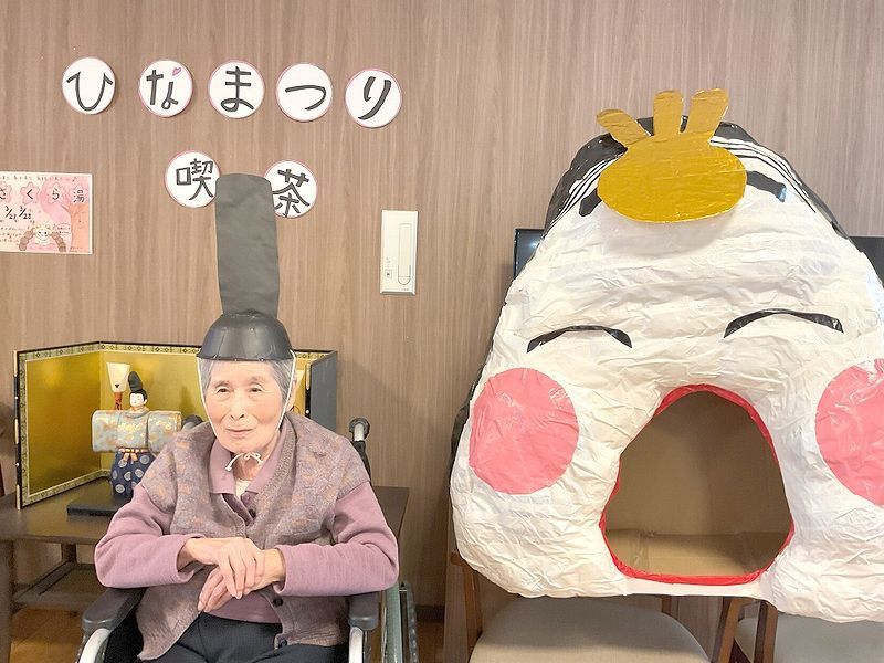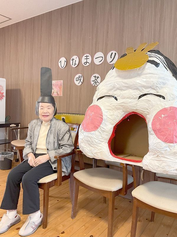最後は雛人形と写真撮影!雛人形の他に節分の時に作った「お福さん」をお雛様に見立てて黄金の髪飾りをつけて飾っていましたがお内裏様がいないのが寂しそう…と言うことで入居者様にお内裏様の帽子を被って一緒に撮らせていただきました☆
