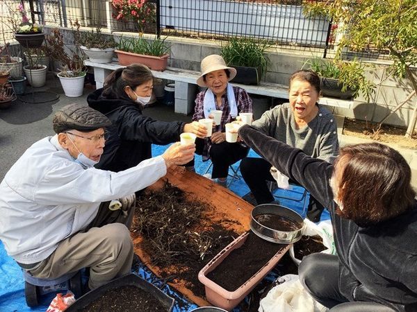女性陣の連携プレーが光る中、あっという間に植え付けが終わり、こちらも最後に水やりを行い、この日の園芸活動は無事終了(*^^*)