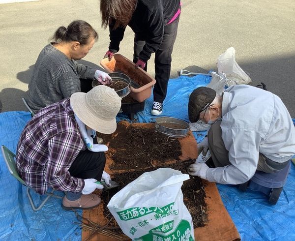 選別したシランの株をプランターにもどし、浅めに土をかけ、水あげを協力して行いました。