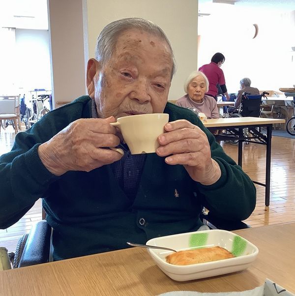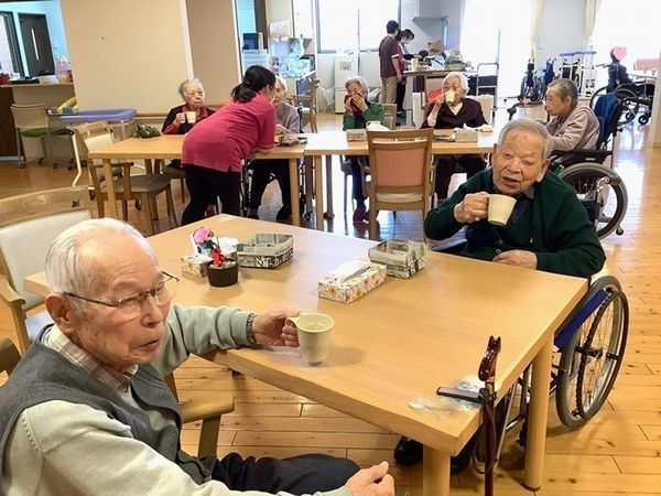 お茶がいきわたったら入居者様と職員で「かんぱーい!」と唱和♪一仕事終えた後の一杯は格別ですね♪