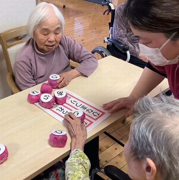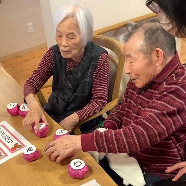 『さくらもち』『おひなさま』等、季節の言葉を探します。「ここにあるよ」と他の入居者様が助言をしたり、お隣の方の文字を気付かずにとってしまったり…。文字が完成すると「できたー!」と、自分のことのように一緒に喜んでくださる姿も(*^^*)