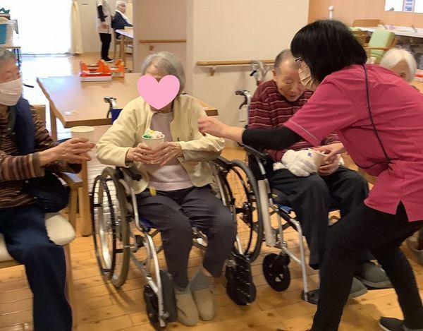「洋菓子かと思ったら和菓子の味でおいしかった」と、見た目と違ったおいしさでビックリされた入居者様もいらっしゃいましたが、おいしく召し上がっていただけたようでした♪