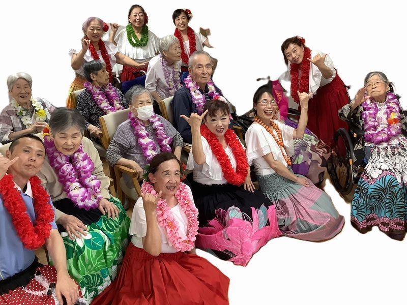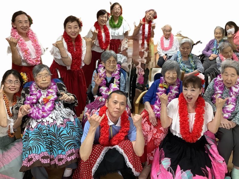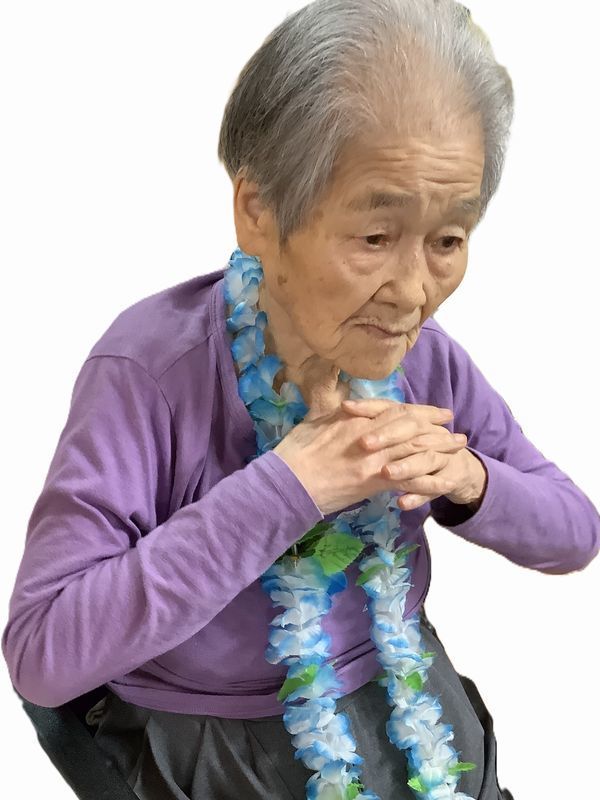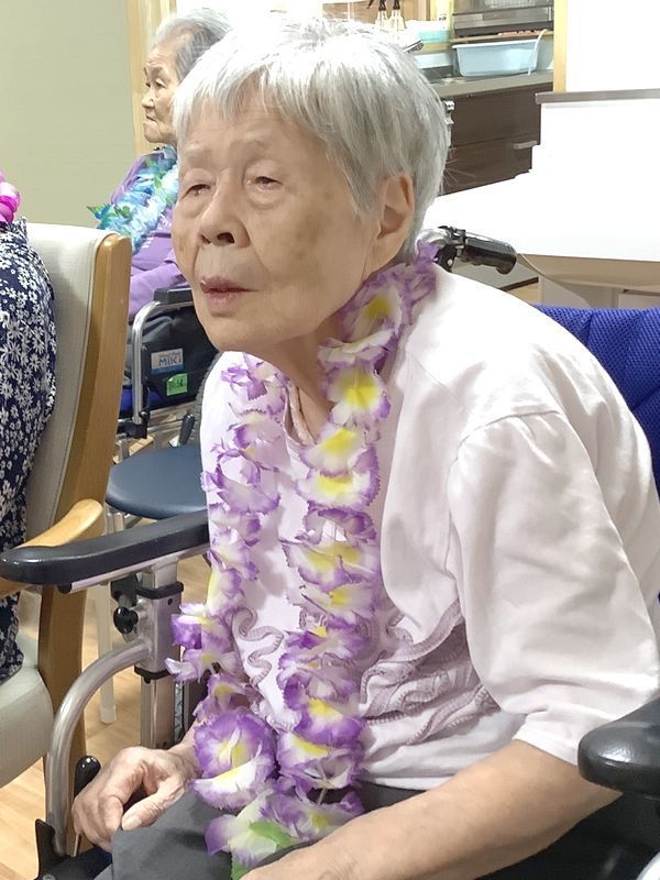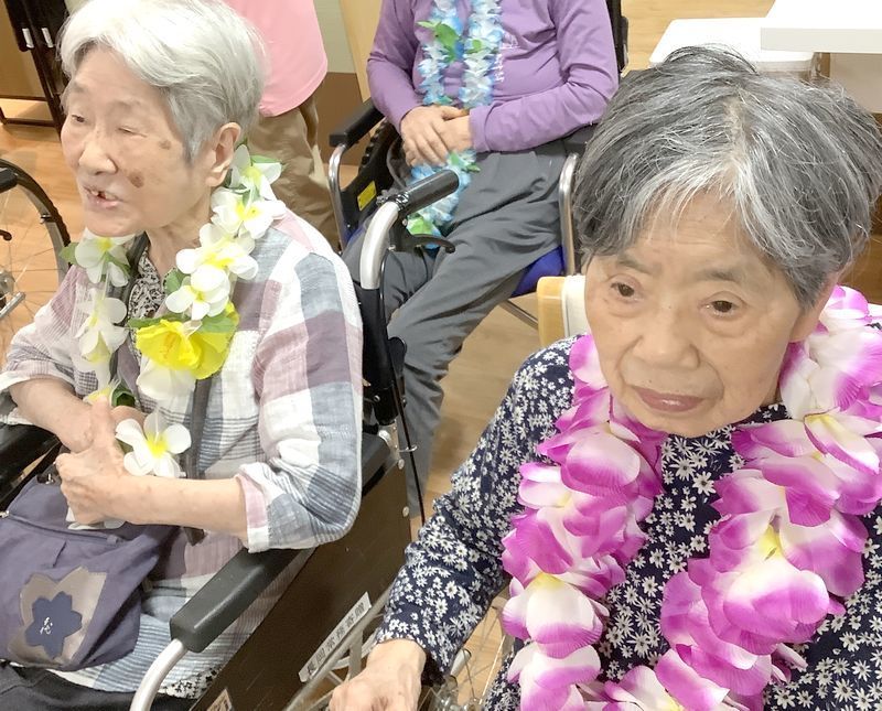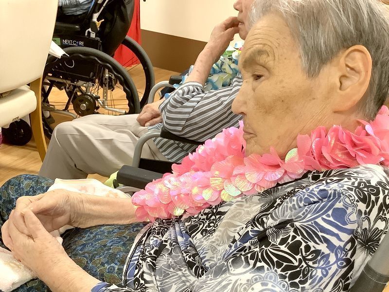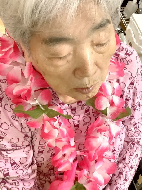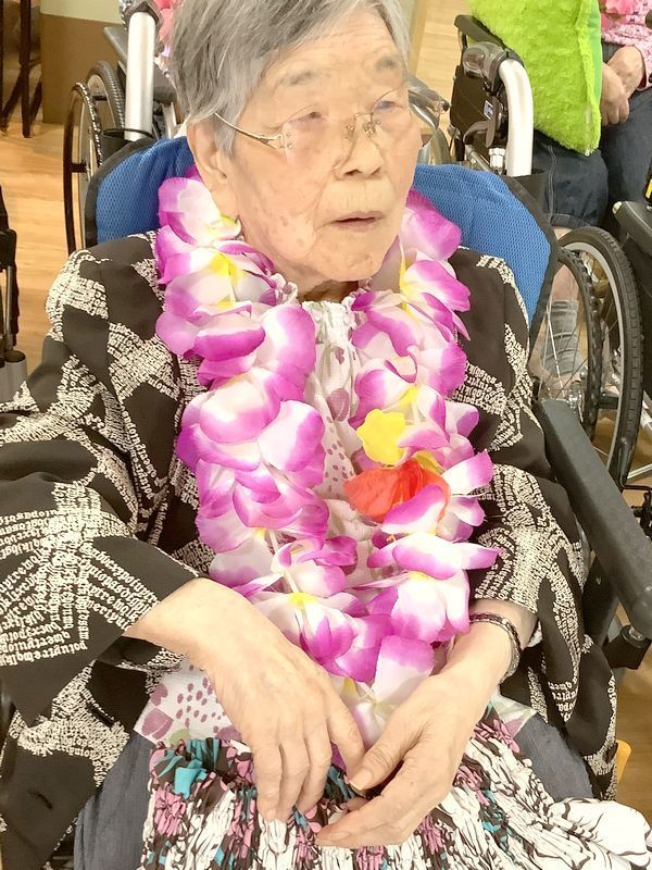 お一人おひとりにレイをかけていただくと「きれいやなぁ」と嬉しそうにされていました。