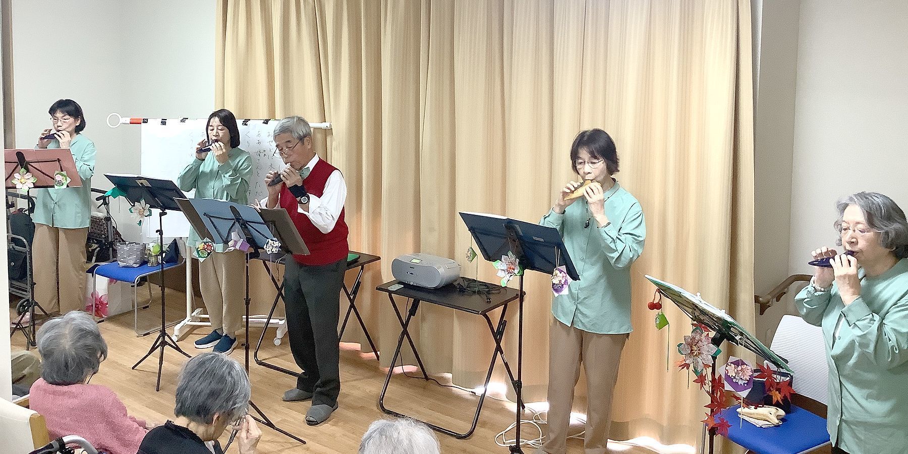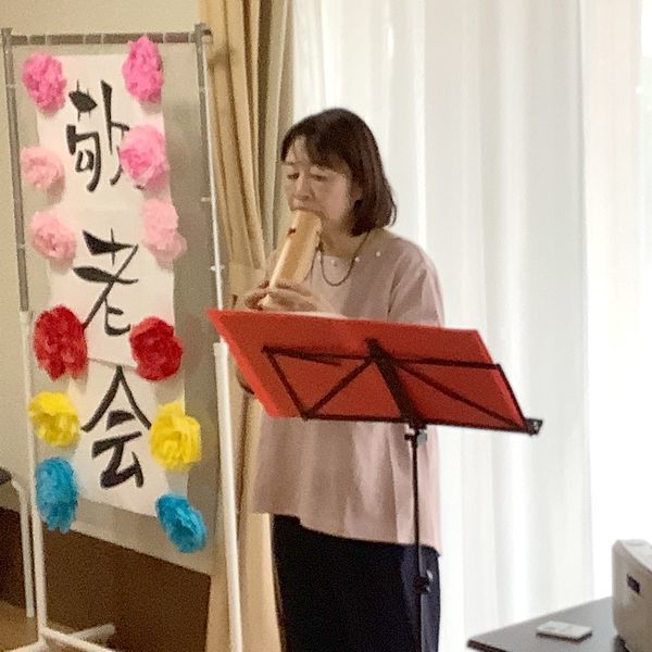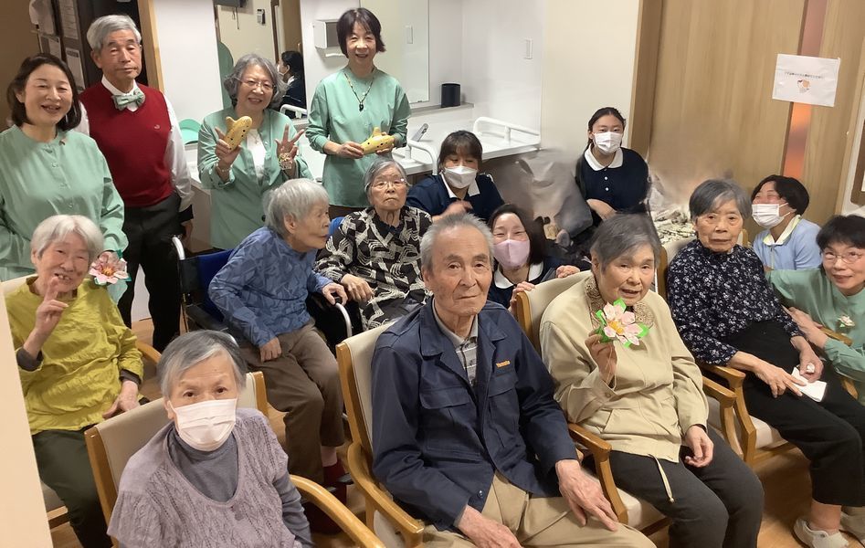 入居者様は、オカリナの演奏に合わせて歌を唄ったり、手作りのでんでん太鼓も鳴らされたり、笑顔が多い時間でした。