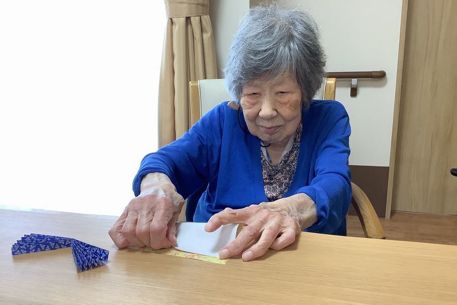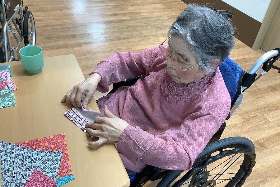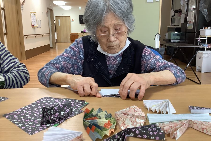 真剣な表情で千代紙のお花を作ってくださいました。