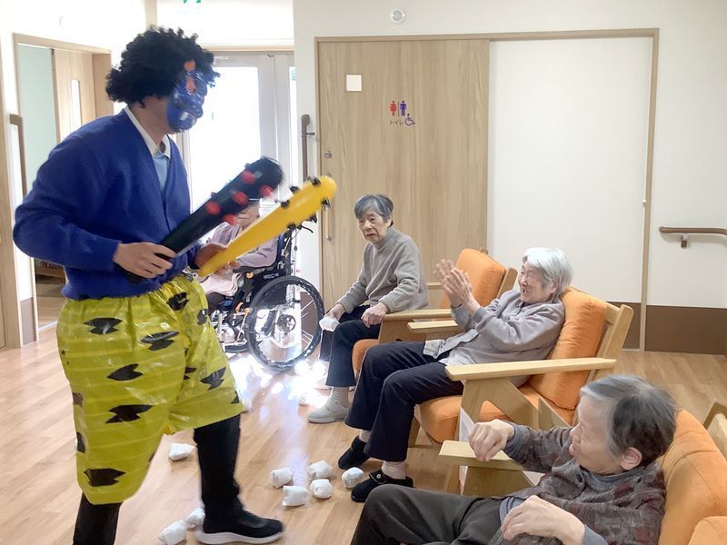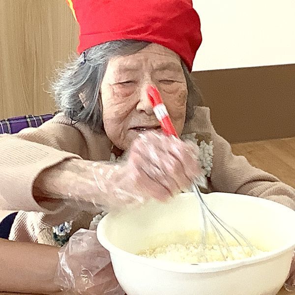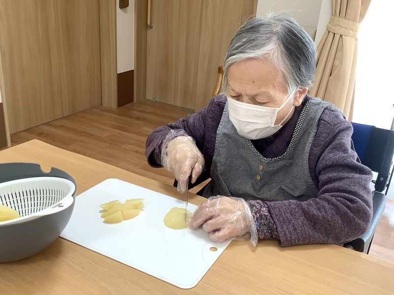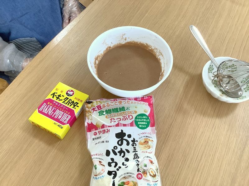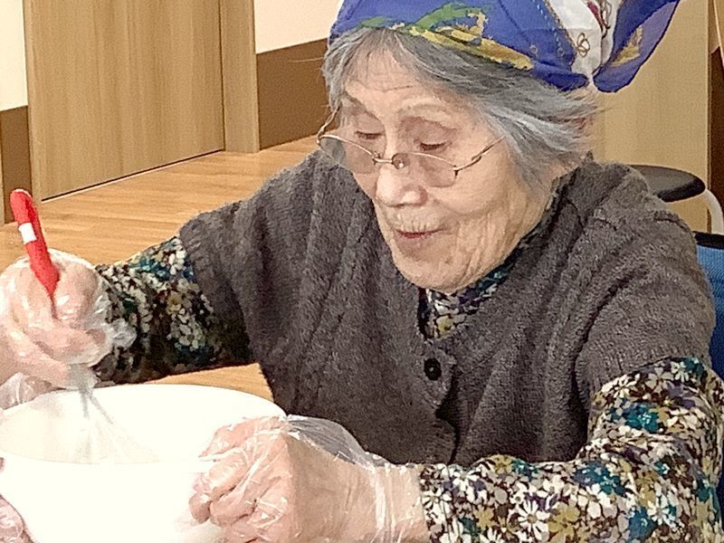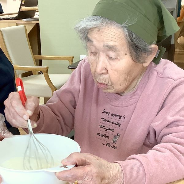 入居者様にフルーツのカットやホットケーキミックスと玉子、牛乳を混ぜる作業をご協力いただきました。