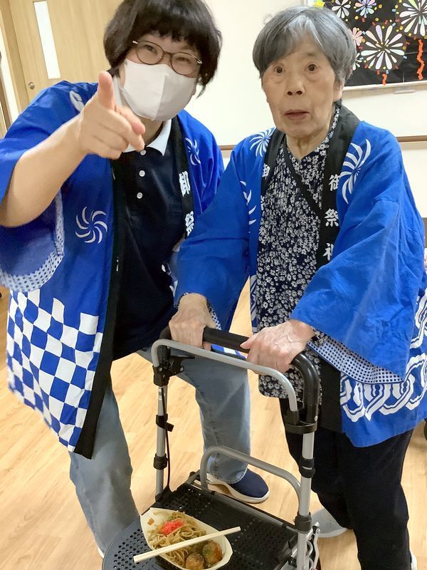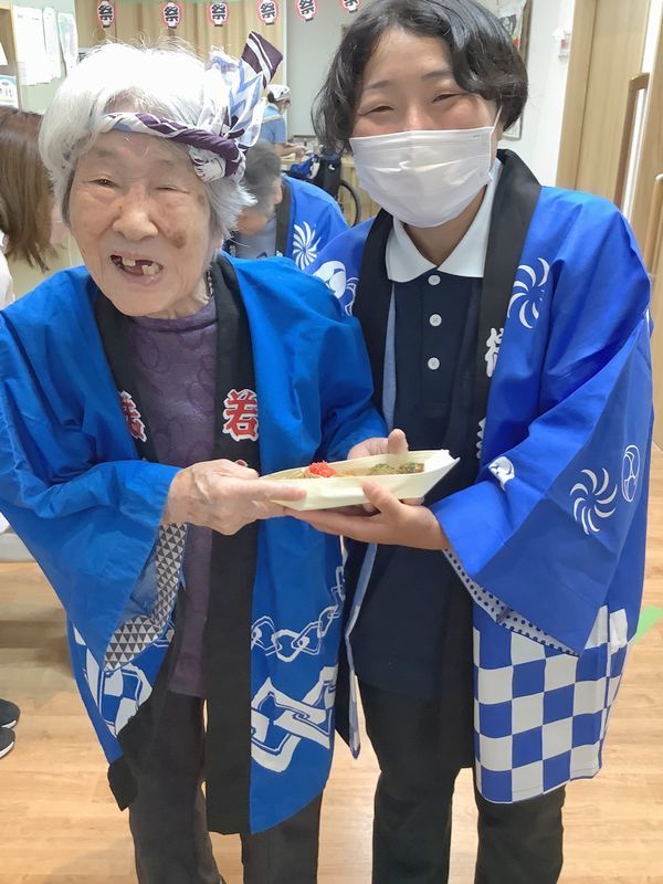 お祭り当日までに入居者様と提灯を作ったり、祭りの飾り付けを行ったり、盆踊りの練習をしたりと気分はどんどん盛り上がっていきました(^^♪