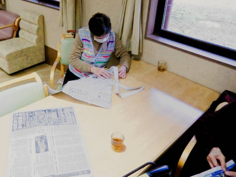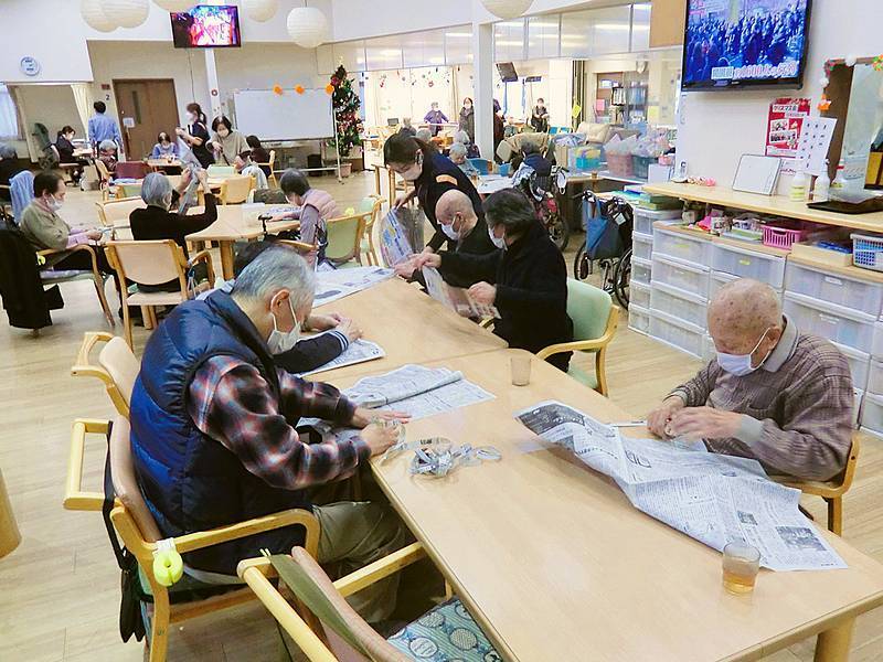 皆様真剣に取り組んでおられました。「この新聞紙、縦と横どっちから切ったら長くなるかなぁ?」「焦ったらちぎれてしまうわ」などと、同じテーブルに座っておられる利用者様同士で相談し、試行錯誤しながら作っておられました。