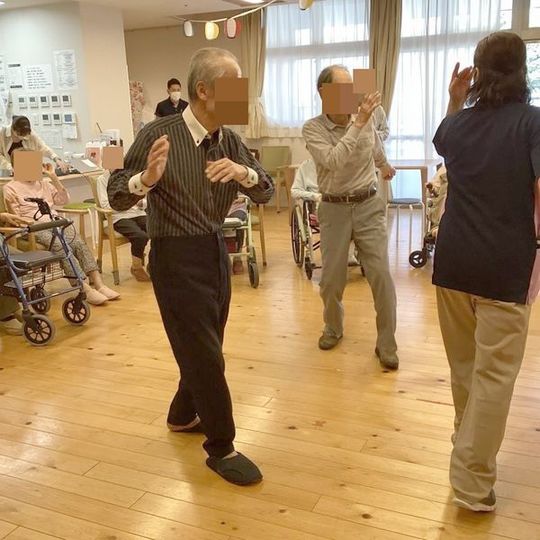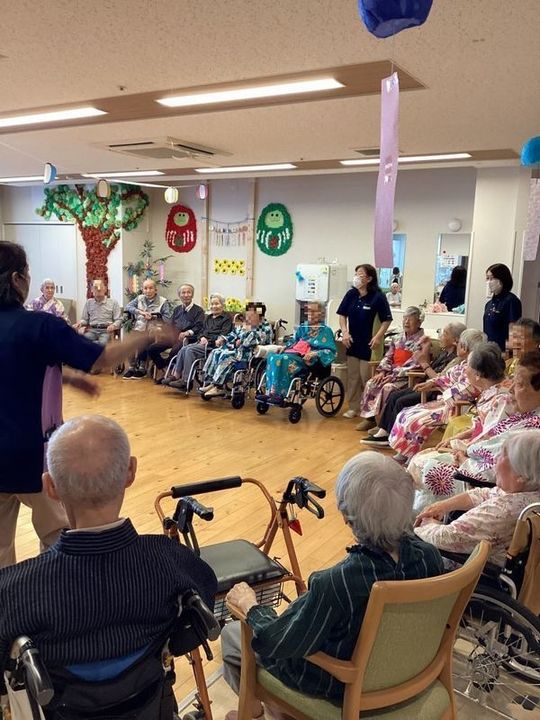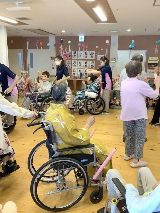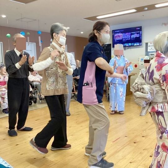 皆さん方、初めはは恥ずかしがってなかなか踊られませんでしたが、スタッフの声掛けに男性入居者様が前に出て踊りだすと、恥ずかしがっていた方たちも次々と踊りの輪に入ってくださいました!(^^)!
