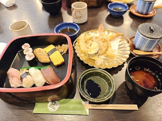 お寿司に天ぷら、エビフライ、から揚げから選べる副菜と茶碗蒸しも付いていて「出前もいいけどやっぱり食べにくるとさらにいいね」「茶碗蒸し久しぶりで嬉しい」