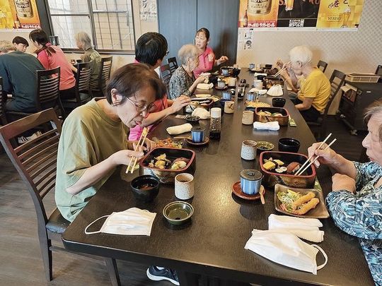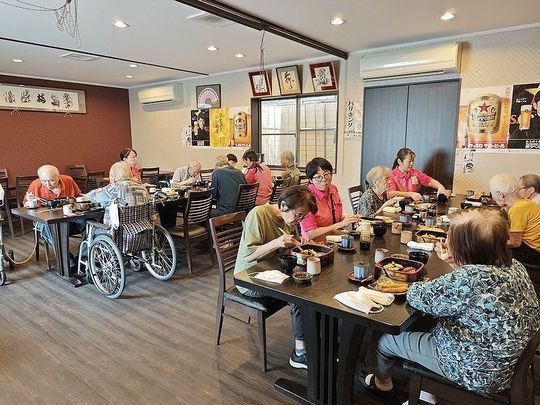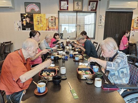 敬老会は毎年近所のお寿司屋さんから桶のお寿司を出前していただいていますが今年はなんと!当日のご利用者様全員でランチに出かけ敬老会をおこないました。