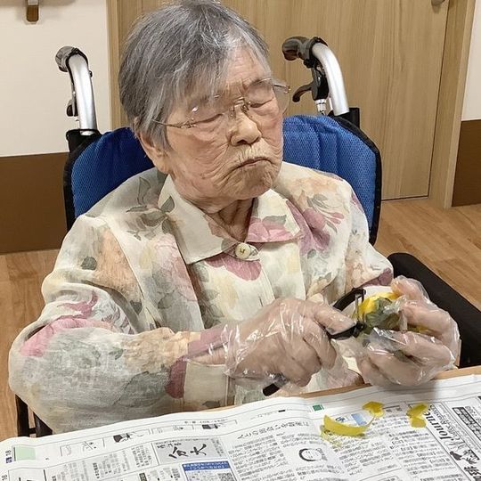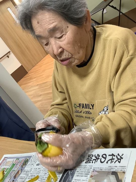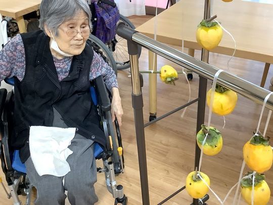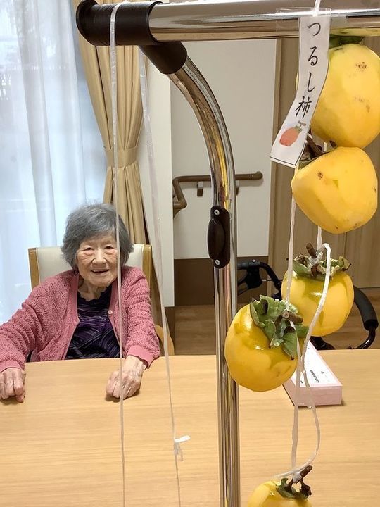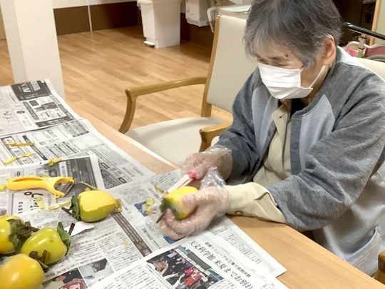 入居者様に渋柿の皮をむいていただき、ひもでくくり、外へ干しています。