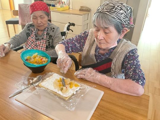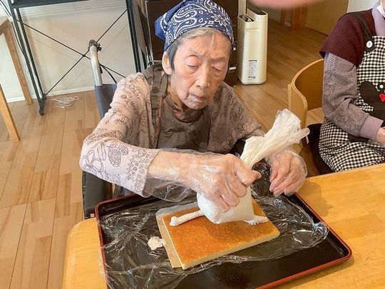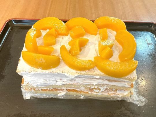スポンジの土台に大量の生クリームや果物をトッピングし三層のケーキが出来上がりました。