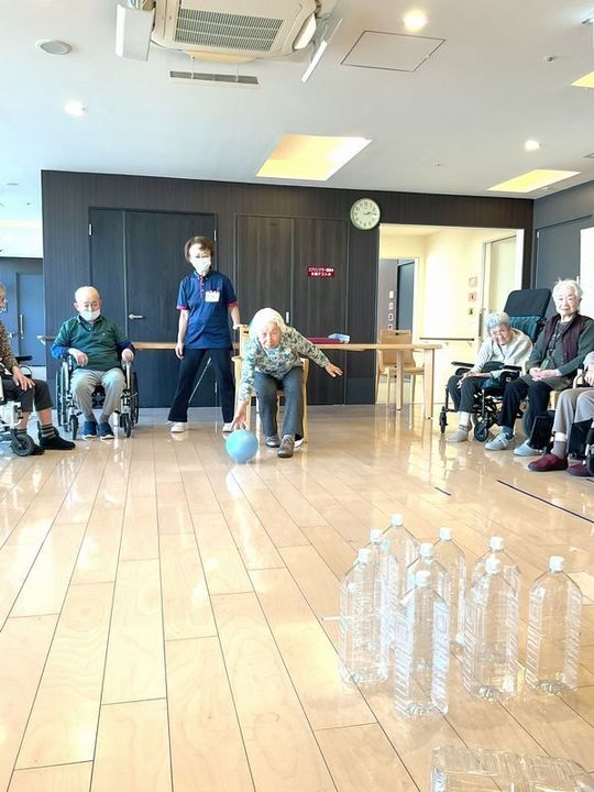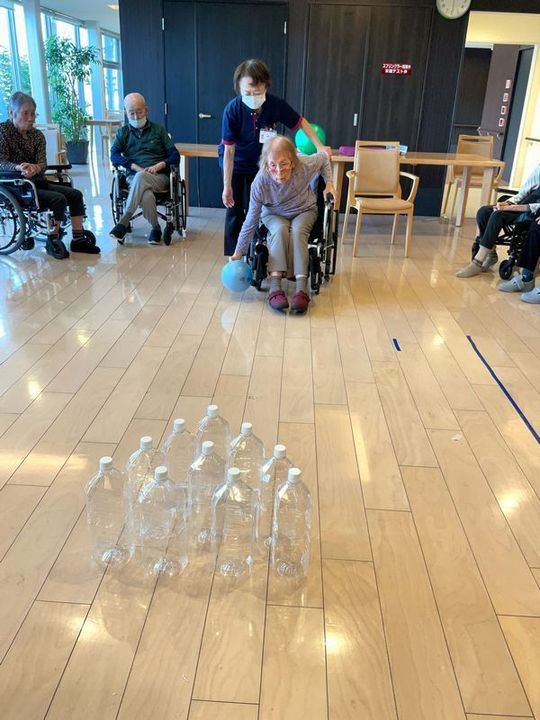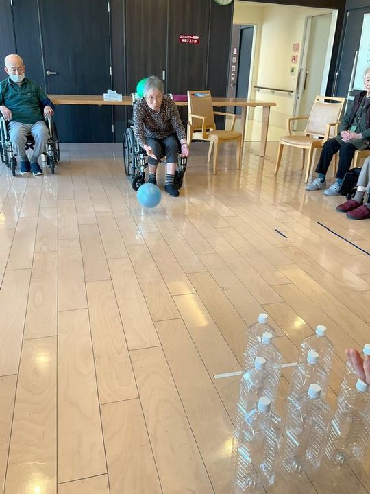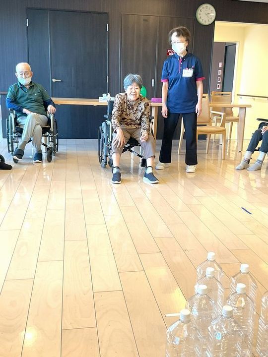 その後、入居者様の番ですが、パンパンになったボールはやはりいつもと一味違く、まず「つかむ所がなく持ちづらい(汗)」そして「そのせいでいつもよりコントロールが難しい」最後に「でも当たると威力が高い!」となかなかの暴れん坊ぶりを見せてくれました!