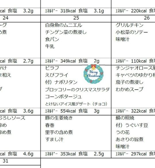 25日の昼食、クリスマスメニューに注目です!特にブロッコリーのクリスマスサラダ、食べてみたいですね(*^-^*)