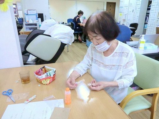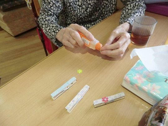 9月11日(木)のレクリエーションの時間に手芸部として100均の商品を木製クリップやマスキングテープ等を使い可愛いマグネット付クリップの制作をしました。