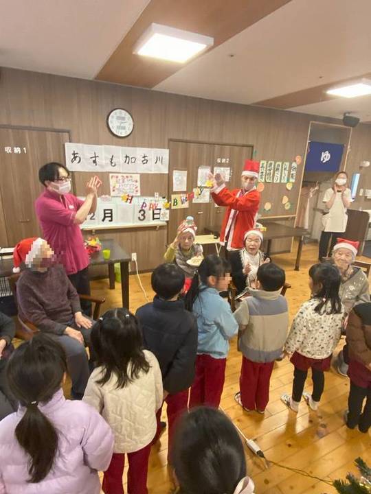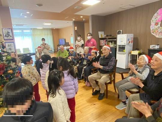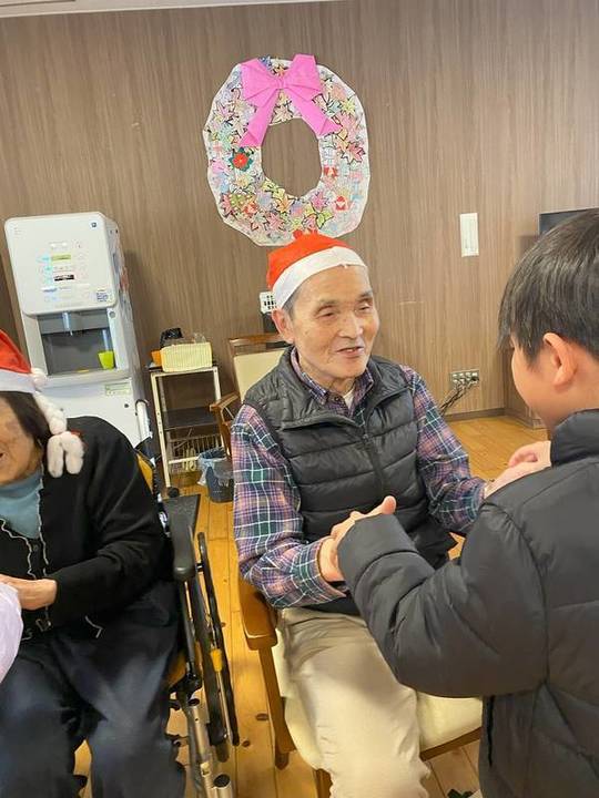 元気いっぱいの声で 「赤鼻のトナカイ」 を歌ってくれ、クリスマスムードに包まれました。利用者様も手拍子で参加され、「かわいいねぇ」「また来てほしいわ」と大好評でした。