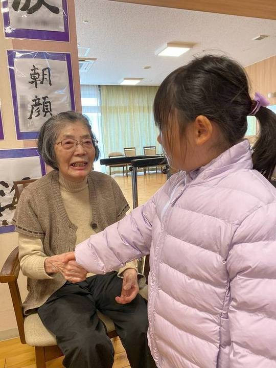 元気いっぱいの園児さんたちは、フロアに入るとすぐに利用者様のもとを回り、順番に握手をしてくれました。かわいらしい姿に、皆さま自然と笑顔になり、「来てくれて嬉しい」「元気をもらった」ととても喜ばれていました。