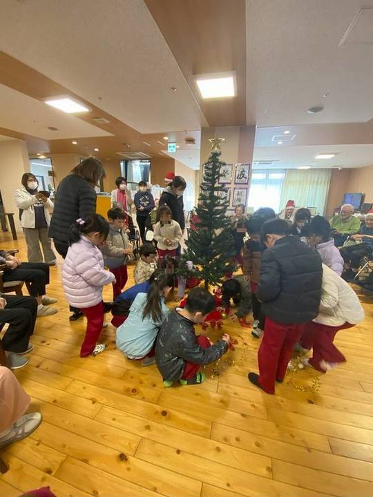 ツリーの飾りつけでは、園児さん同士で喧嘩することもなく、「これがいいかな」「次これね」と声をかけ合いながら、譲り合って順番に飾りをつけてくれました。その丁寧で一生懸命な姿に、利用者様も職員も思わずほっこり。飾りが増えるたびにツリーはどんどん華やかになり、「きれいねぇ」と歓声があがっていました。