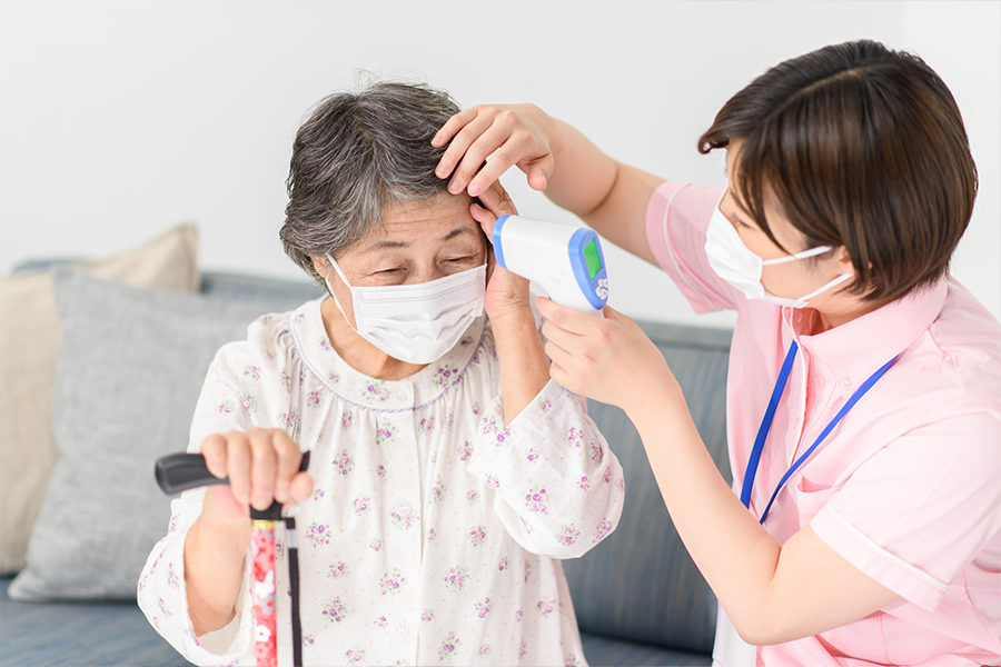 血圧・体温・脈拍などを測定し、ご利用者さまの体調を把握します。入浴介助で快適なお風呂の時間を援助。心安らぐひと時をお楽しみください。