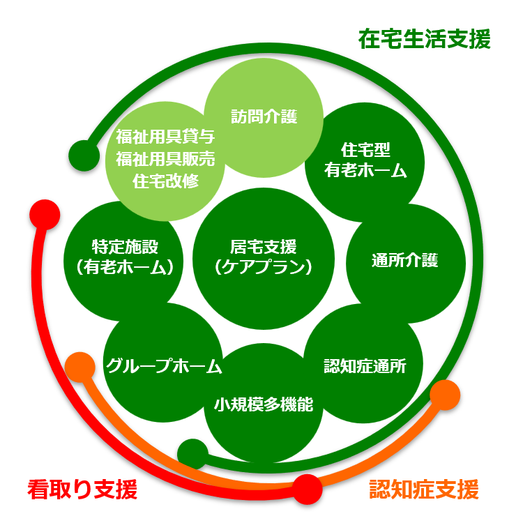 地域に根ざした介護を実現するため、当社では各地域の特性に応じた多様な介護サービスを展開し、ご利用者さまの状態やライフステージに合わせた「選べる介護」を実現しています。